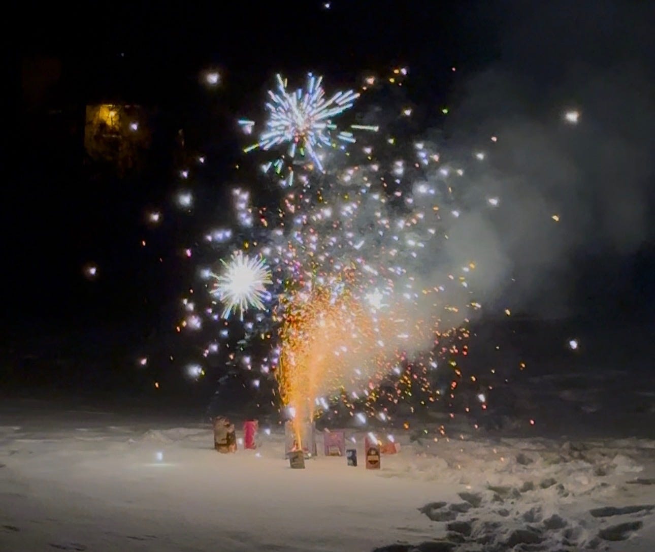 Dan and I, for the most part, don’t make it until midnight. Well, ok, sometimes I do, but generally the pets and I mark the moment together (and Tim and I text if he has a show that night). We still mark the occasion together, however. This year, we set out a spread of hors d’oeuvres for ourselves and Em — her boyfriend, Breyden, had to work until 8, and Billy was at the aforementioned party (not in a basement). After dinner, Dan and Em wrapped me in a blanket, sat me in my Adirondack chair on the back deck, gave me a mug of mulled wine, and proceeded to put on a spectacular fireworks show in the snow. (Dan put on the show, Em was the official photographer.) Folks, fireworks were meant for the winter. Sitting in the bitter cold and watching the colorful explosions against a snowy backdrop was the perfect way to send out 2025. We set the old year on fire, in order for 2026 to rise from the ashes as a glorious, sparkling phoenix. (Figuratively, on many fronts, since for one thing it was 7pm and we were ready for bed.)