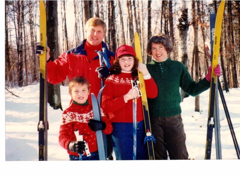 Eventually my parents moved away from downhill skiing (I think for everyone’s safety, not just mine!) to cross country skiing. My most vivid memories of childhood winters are being in the woods on cross country skis. My dad, especially, was passionate about the amount of groomed trails in our area. He was instrumental in the creation of lighted trails in the forest behind our high school, and in ensuring designated trails for traditional skiiers — meaning that cross country “skaters” and snowmobiles couldn’t use them and mess up the tracks.